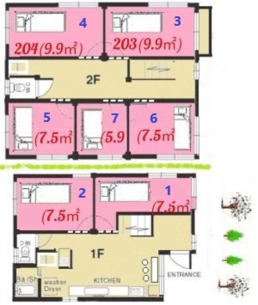 個室(全7室)は全て家具付き完全個室。ベッド、冷蔵庫、冷暖房、チェア、テーブル、カーテン、照明器具、Wi-Fi完備で、引っ越し当日からすぐに快適な生活をスタートできます。さらに、火災報知器や、2階の部屋には災害用避難ハシゴも備え付けられており、セキュリティ面も安心です。特に今回ご紹介する,「Room1」は南向きの角部屋,で窓が2ヶ所あり、一日中陽当たりが良く開放感に溢れています。明るい部屋で心地よい毎日を送りたい方に最適です。