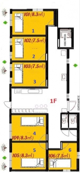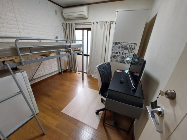 個室にはベッド、冷蔵庫、冷暖房、椅子、パソコン台、Wi-Fi完備。2階の部屋には災害用非難はしごも付いており、安心です。